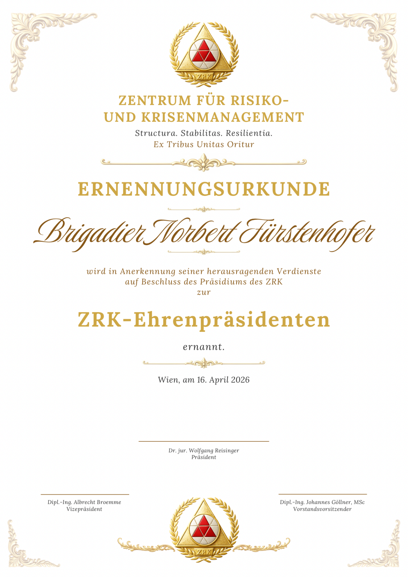 Die Ehrenpräsidentschaft für Brigadier i.R. Norbert Fürstenhofer würdigt eine Lebensleistung, die Ausbildung, Standardisierung und strategisches Denken über Jahrzehnte geprägt hat. Sein Beitrag liegt vor allem im Aufbau nachhaltiger Strukturen – von militärischer Ausbildung bis hin zur Mitgründung des ZRK.